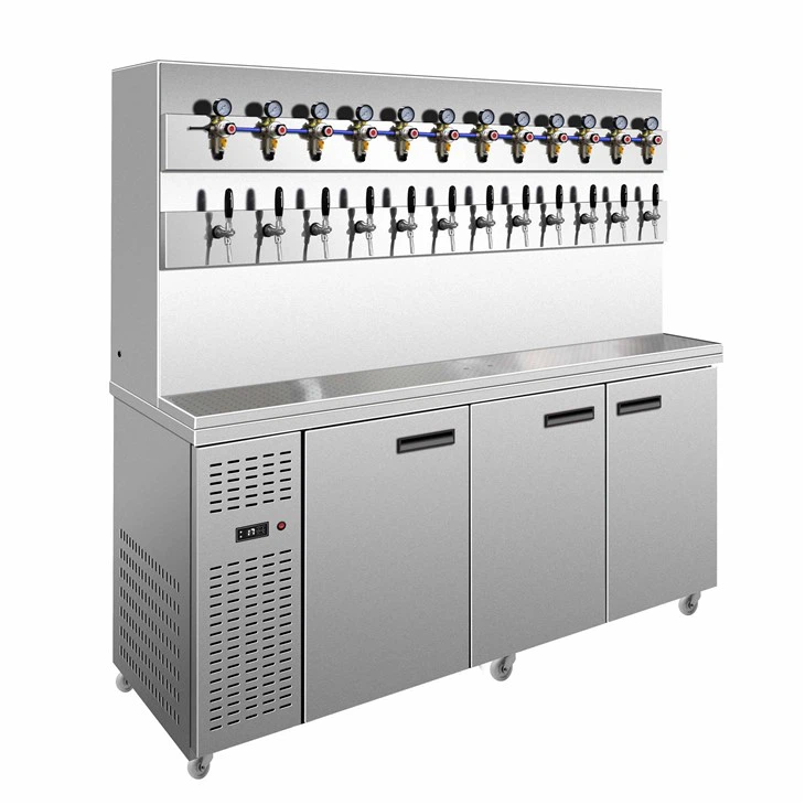 The panel can be optionally equipped with beer taps, Pegas filling heads, secondary pressure regulators, display screens, sight glass decorative lighting, or logo lighting. It supports the installation of 12–24 taps. The unit features an integrated stainless steel drip tray with the same length as the equipment, and the drip tray can be fitted with a glass rinser.